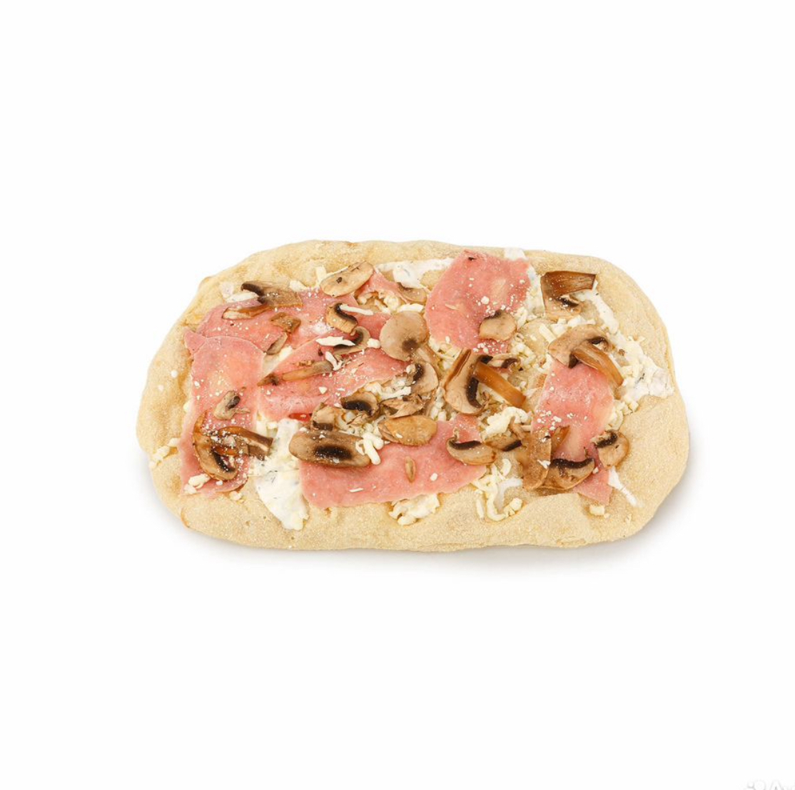 вода питьевая, мука пшеничная, мука соевая, мука рисовая, мука из твёрдой пшеницы, закваска, соль морская, дрожжи хлебопекарные, масло подсолнечное, сыр мягкий моцарелла, соус сливочный, сыр пармезан, шампиньоны свежие резанные, соус майонез, сметана м.д.ж. 20%, ветчина куриная.