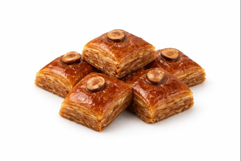 Фирменная пахлава с фундуком — наслаждение вкусом Востока прямо у вас дома! Наш десерт тает во рту, удивляя своей нежностью и ароматом. Сладость медовых слоев филигранно сочетается с хрустящим орехом, создавая незабываемое гастрономическое удовольствие!