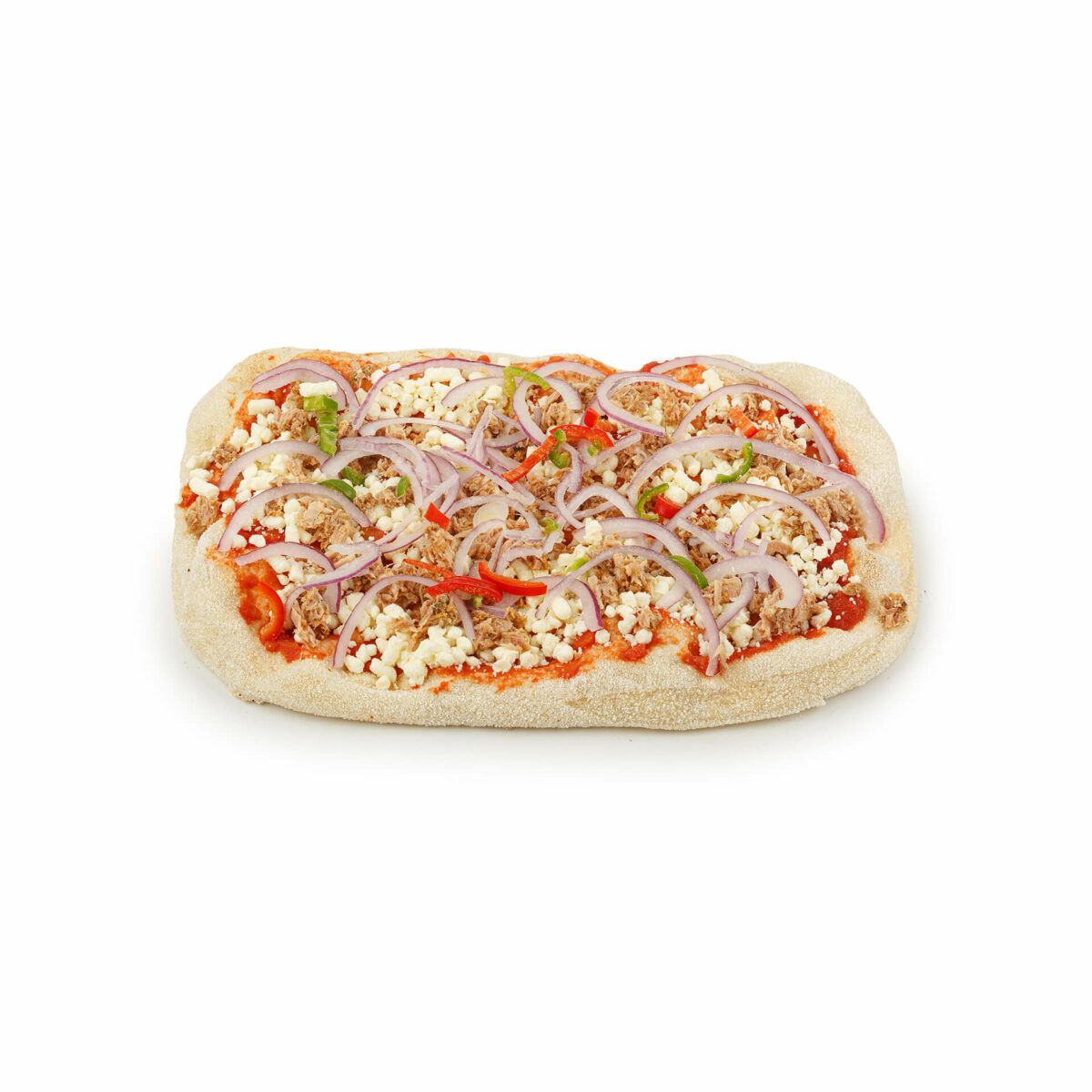 вода питьевая, мука пшеничная, мука соевая, мука рисовая, соль морская, масло оливковое нерафинированное высшего качества (Extra virgin olive oil), дрожжи хлебопекарные, масло подсолнечное, соус томатный, сыр моцарелла, тунец, лук красный, перец чили.