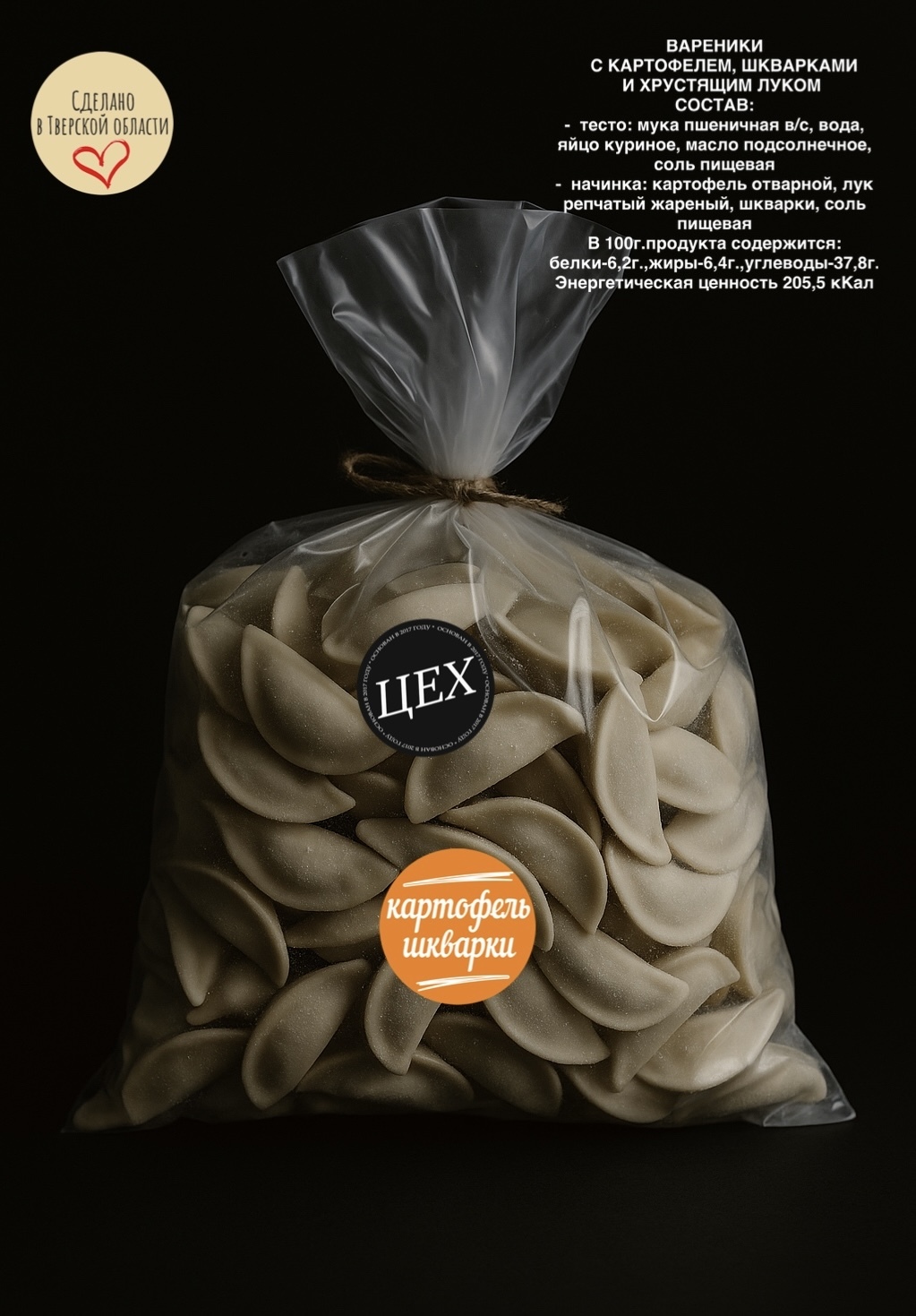 Вареники с картофелем, шкварками и хрустящим луком. 2 кг. Выгода 168₽.