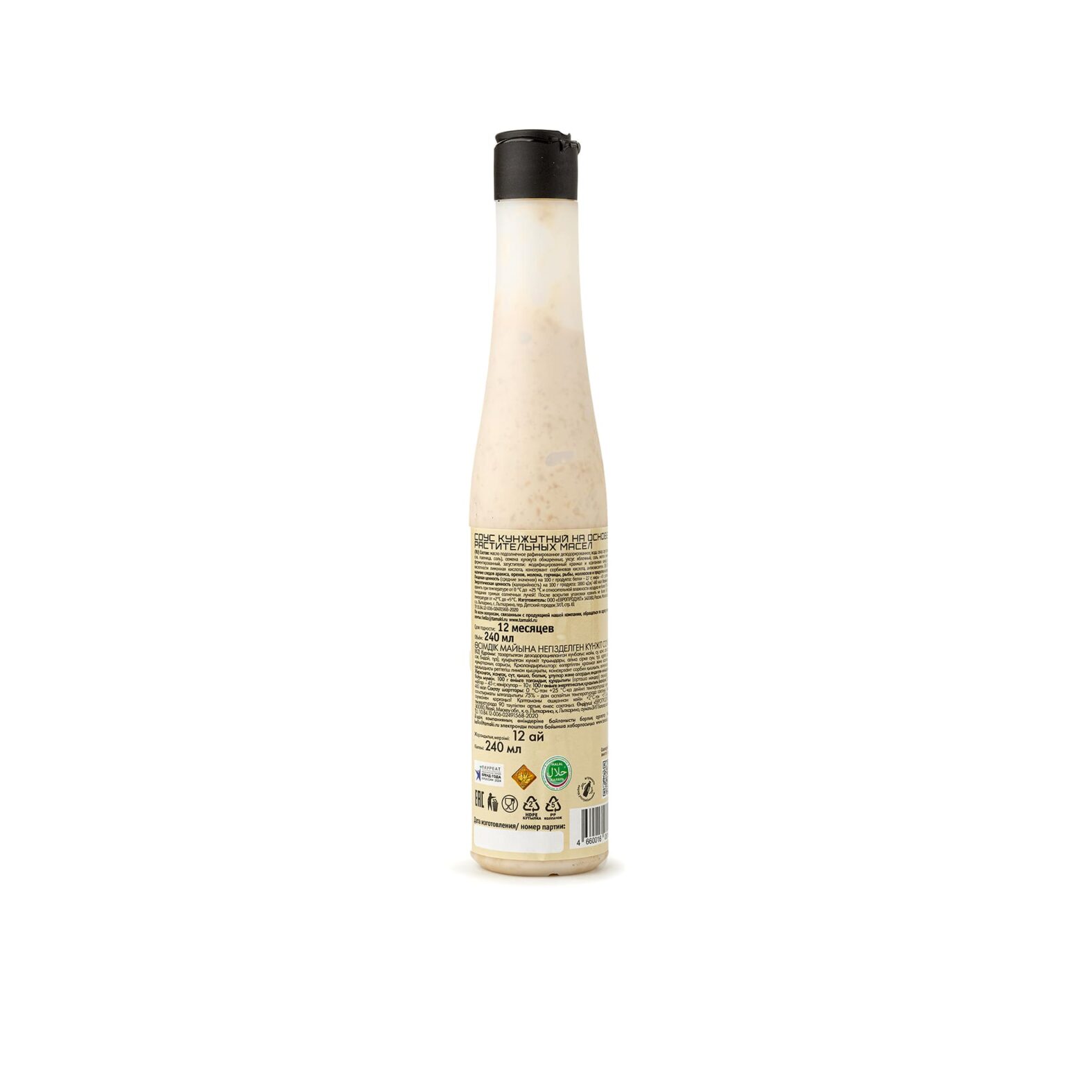 масло подсолнечное, вода, сахар, соус соевый (вода, соя, пшеница, соль), семена кунжута обжаренные, уксус яблочный, соль, желток яичный сухой ферментированный, крахмал, лимонная кислота.